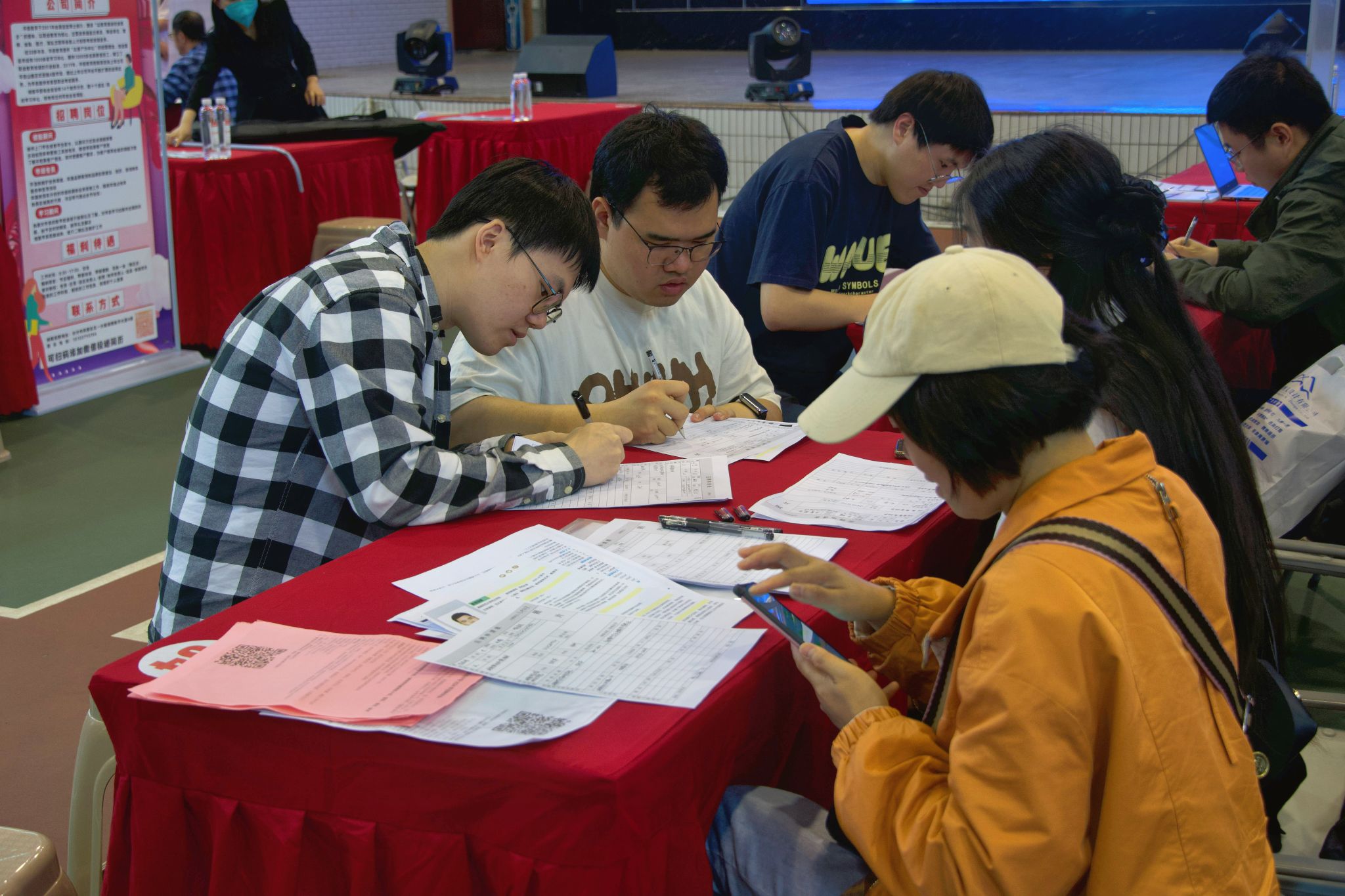 招聘会现场气氛热烈,应届毕业生向用人单位投递个人简历,用人单位向同学们介绍公司概况、未来发展方向、人员需求等方面情况。