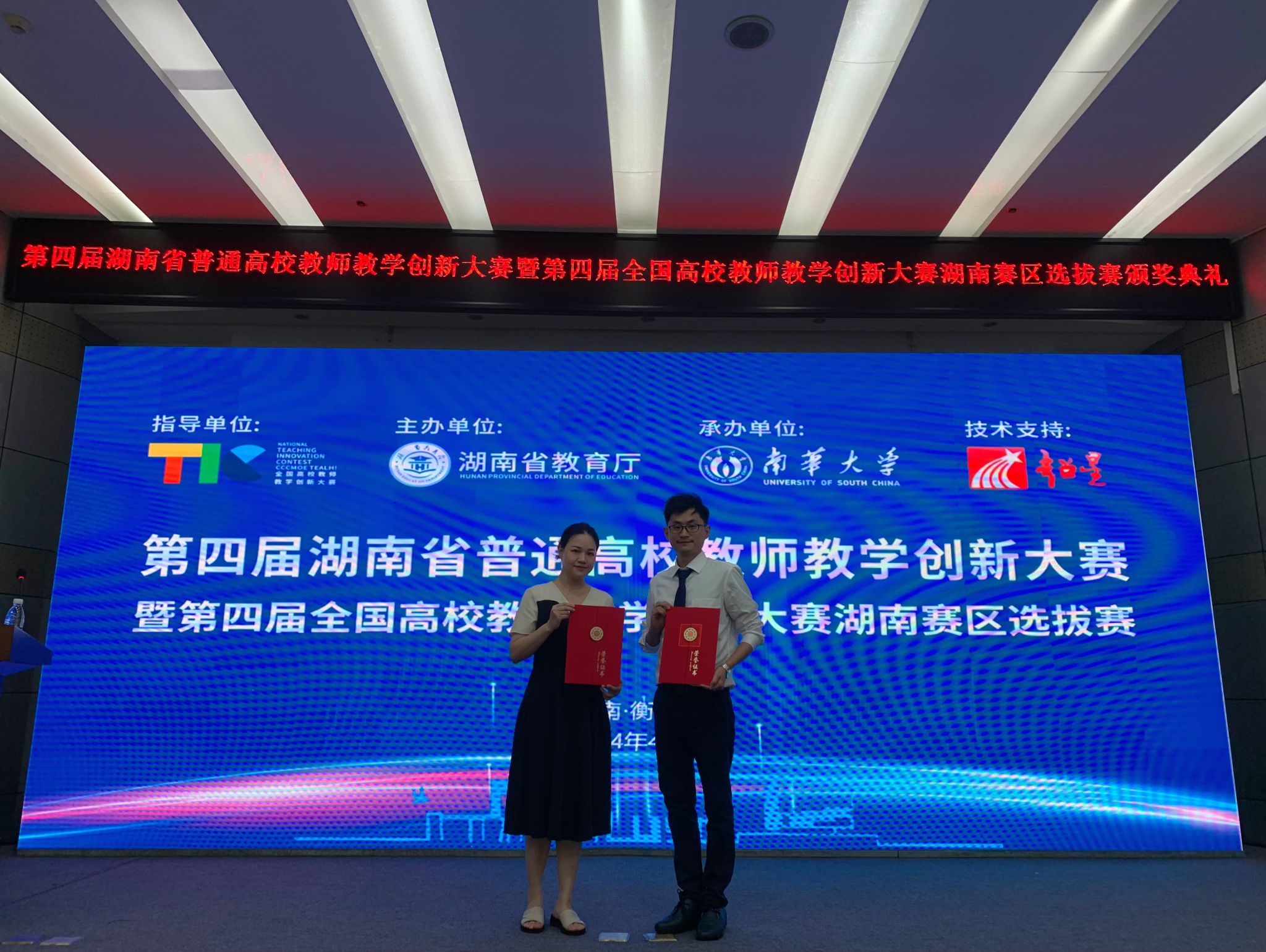 (供稿 院教务办)4月29日,第四届湖南省普通高校教师教学创新大赛决赛暨第四届全国高校教师教学创新大赛湖南赛区选拔赛在南华大学落幕。我院医学系教师田玫、文法系教师杨雨箫分别荣获基础课组一等奖和新文科组一等奖,这是我院首次在同类教学竞赛中双双取得一等奖。
