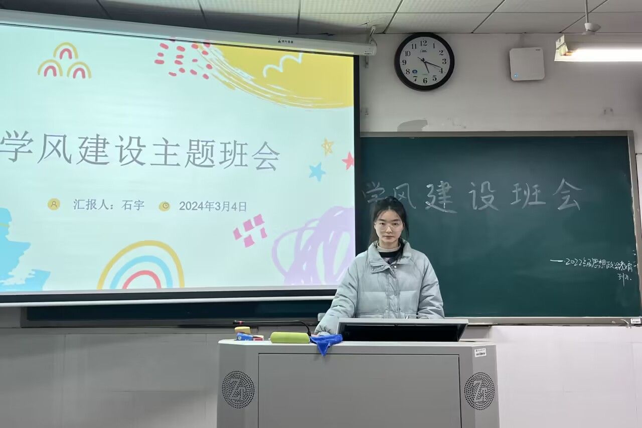 (记者 申晨夕 宋锦萍)3月4日下午,我院教师教育系2022级思想政治教育专业一班于达善楼210教室开展学风建设主题班会,会议由学习委员石宇主持。