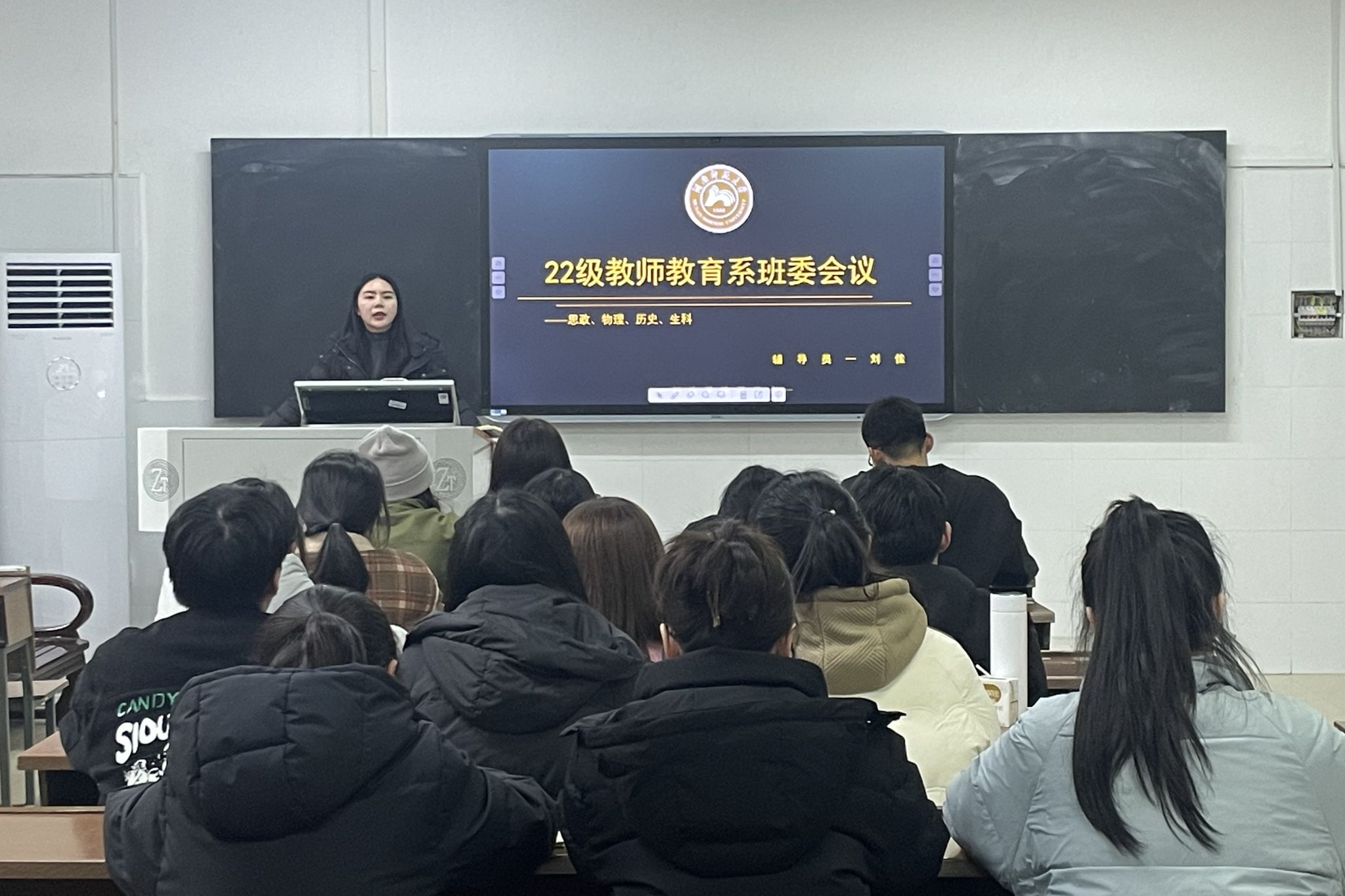 (记者 袁艳芝)3月4日中午,我院教师教育系2022级思想政治教育专业、历史学专业、物理学专业和生物科学专业于达善楼111教室召开班委会议。会议由教师教育系辅导员刘佳主持。