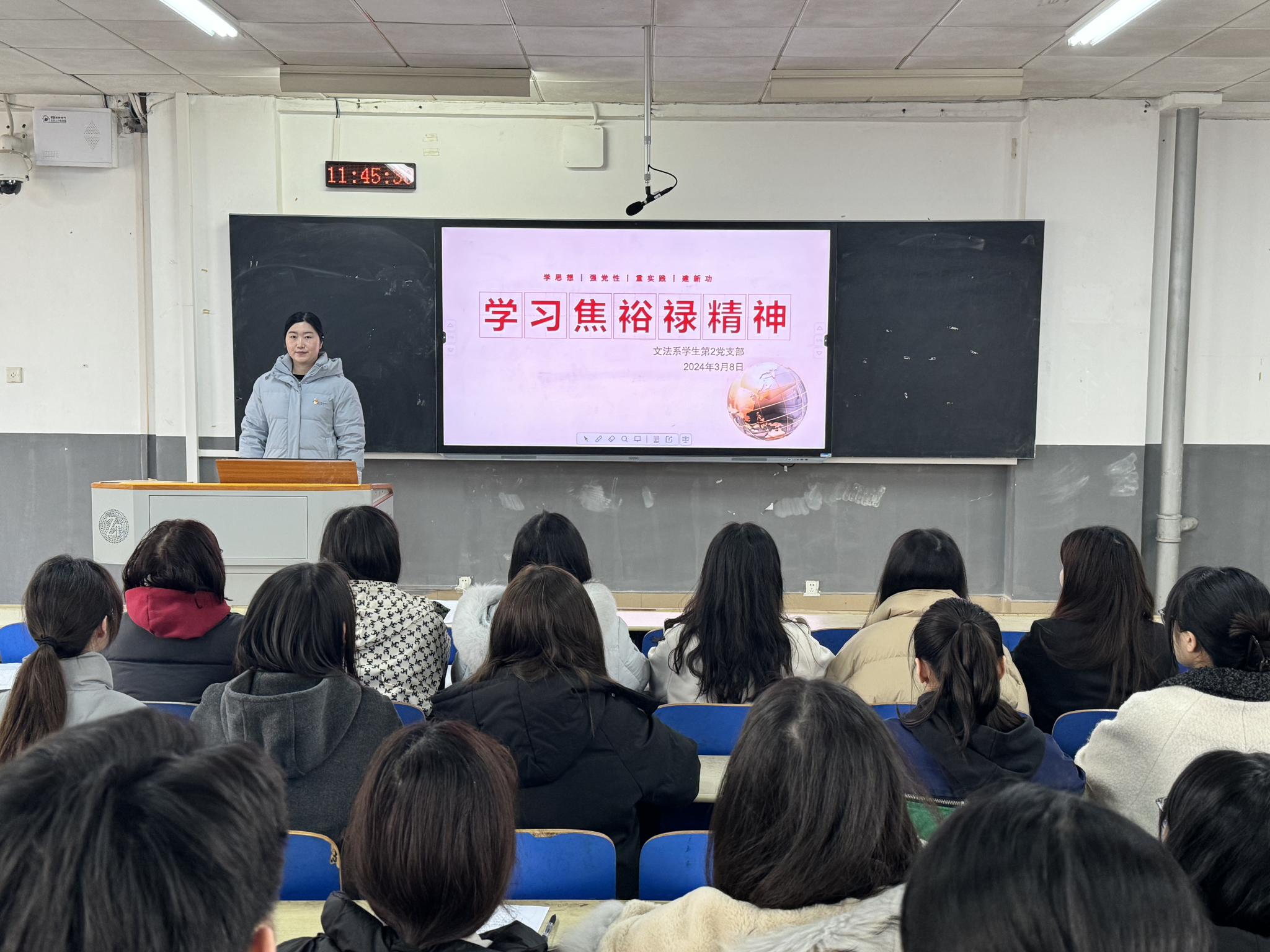 (记者 周慧 李佳怡 吴丹)3月8日上午,我院文法系学生第二党支部在树达楼216教室开展以“学习焦裕禄精神”为主题的微党课。文法系学生第二党支部第一书记彭娇出席会议。文法系学生第二党支部成员方洲洋担任微党课主讲人。