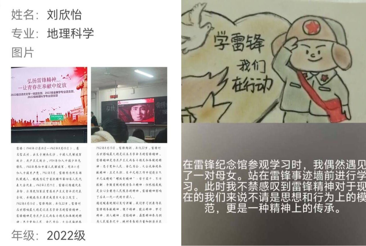 志愿者们通过线上照片、视频、手抄报等形式分享志愿活动故事及心得。大家秉承着“助人为快乐之本”的座右铭,在活动中感受雷锋精神,在志愿服务中贡献出自己的力量。