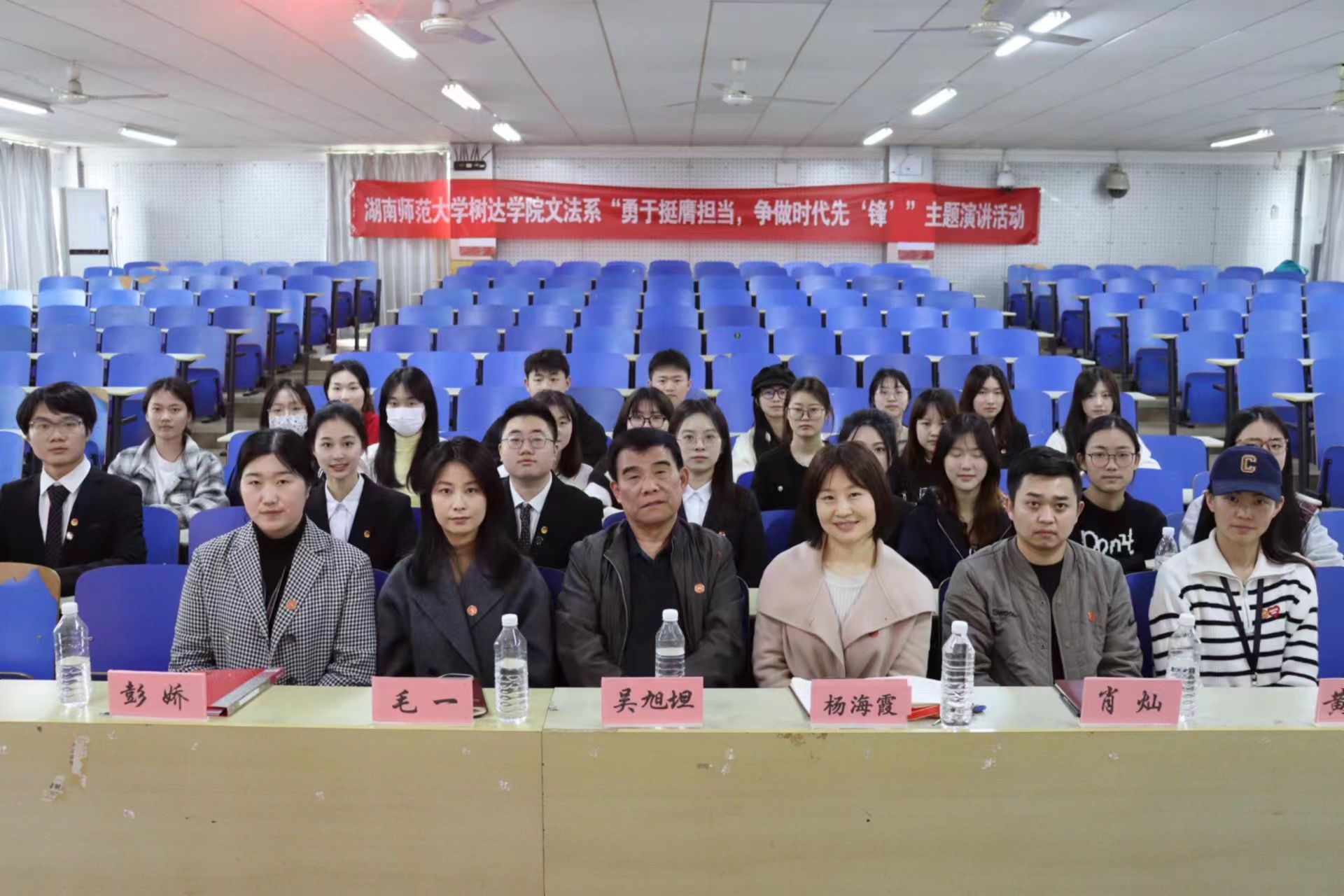 (记者 辜慧敏 尹诗茵 刘婉婷)3月27日中午,我院文法系团总支宣传部在树达楼415教室开展以“勇于挺膺担当,争做时代先锋”为主题的“树达青年说”演讲活动。文法系系主任吴旭坦,文法系团总支书记杨海霞,文法系辅导员彭娇、毛一、肖灿、黄江霞出席活动。活动由文法系学生会办公室成员庄子轩主持。