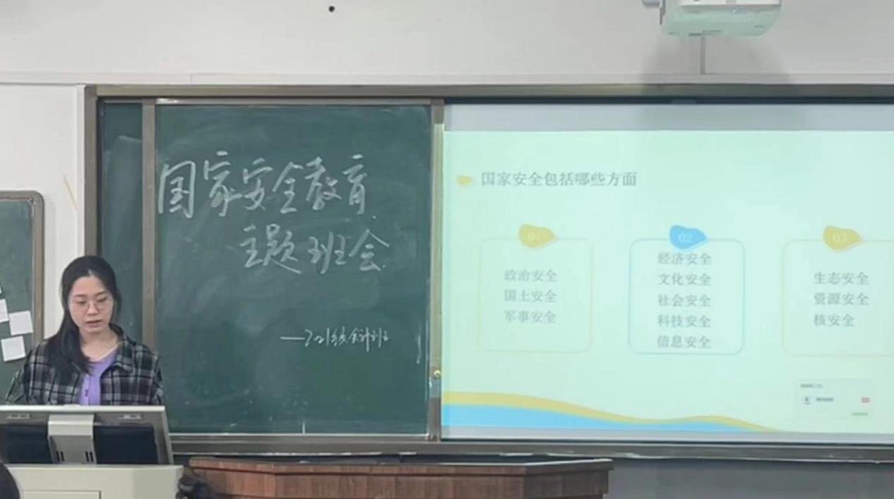 曾向阳通过播放相关视频带领同学们了解什么是国家安全,并详细讲解了当前国际国内形势及危害国家安全的系列行为。她指出,目前我国面临的国际国内环境正在发生深刻变化,站在新的历史起点上,维护国家安全和社会稳定的任务十分艰巨。作为大学生的我们更应该要树立总体国家安全观的意识,为维护国家安全贡献自己的力量。
