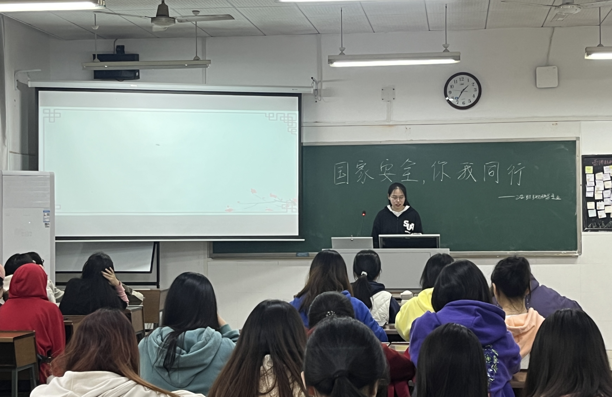 曹雨作会议总结。她强调,此次班会增强了同学们的国家安全意识,树立起“国家平安,人人有责”的观念。大家要认真贯彻法律法规,积极履行国家安全职责,在隐秘斗争战线上,构筑起一道结实的反奸防谍人民防线,为国家安全奉献自己的一份力量。