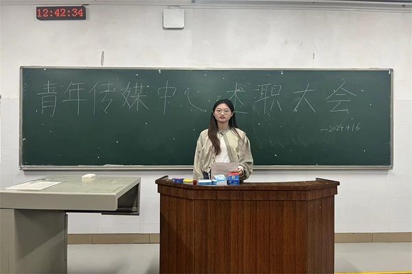 我院第十三届青年传媒中心主任蔡雯作总结发言。她表示,学生干部应明确自身职责,保持良好的工作作风,以饱满的热情投入到工作中去,并学会释放压力,做到劳逸结合。