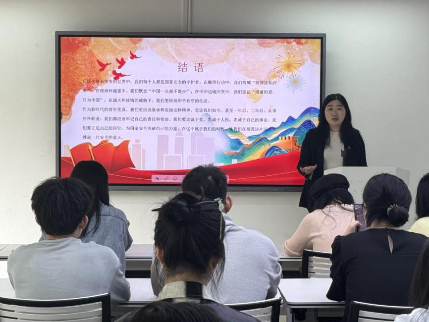 陈盼以“总体国家安全观,创新引领10周年”为方向,介绍国家安全教育日和国家安全教育观,结合当下日益严峻的国际环境,深入探讨个人维护国家安全的权力与义务。她表示,作为青年党员,我们要学习贯彻总体国家安全观,勇于担当维护国家安全责任;应当忠诚于党、忠诚于人民,遵守国家安全法律法规,努力构筑维护国家安全的钢铁长城。