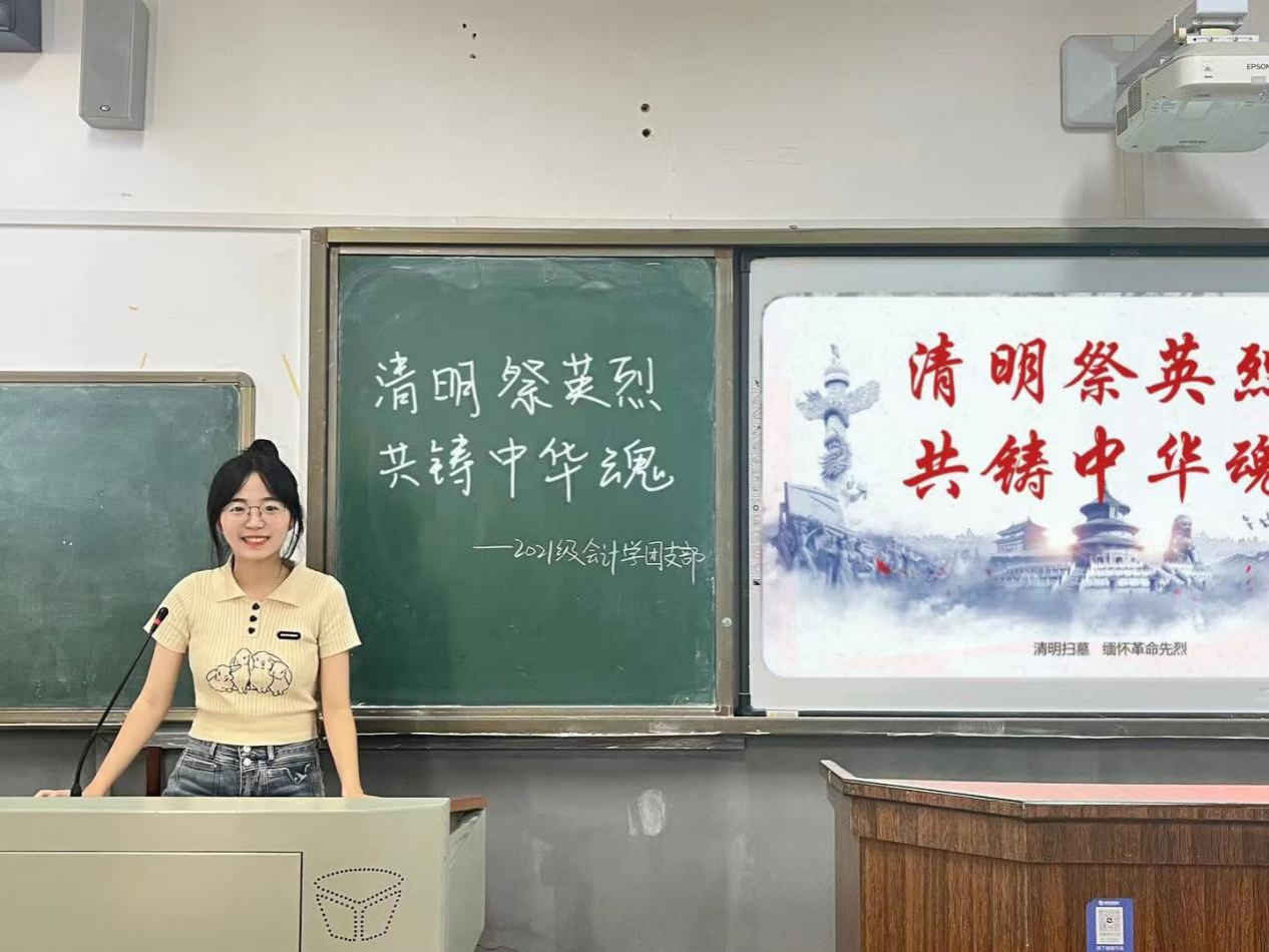 (记者 李依蕾 王尹 粟思瑾)4月19日上午,我院经管系2021级会计学专业在树达楼408教室开展以“清明祭英烈,共铸中华魂”为主题的团日活动。此次活动由团支部书记李雅文主持。