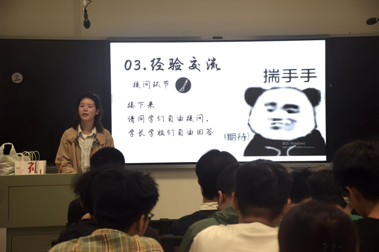 2022级李璇进行经验分享。她表示,同学们在大学生涯中要把学习放在第一位,认真学好专业知识,多参与各类学科竞赛,同时也应积极参与学校活动,全面发展自己的各项能力,为未来步入社会打下坚实的基础。
