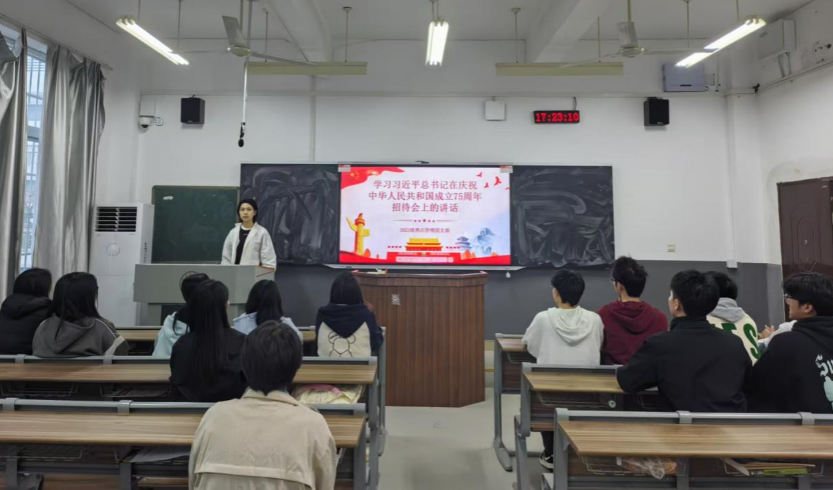 (通讯员 李世凤 王洁 叶俊杰)10月21日下午,我院经管系2022级酒店管理专业在树达楼405教室开展了以“学习习近平总书记在庆祝中华人民共和国成立75周年招待会上的讲话”为主题的团课活动。活动由团支部书记陈紫轩主持。