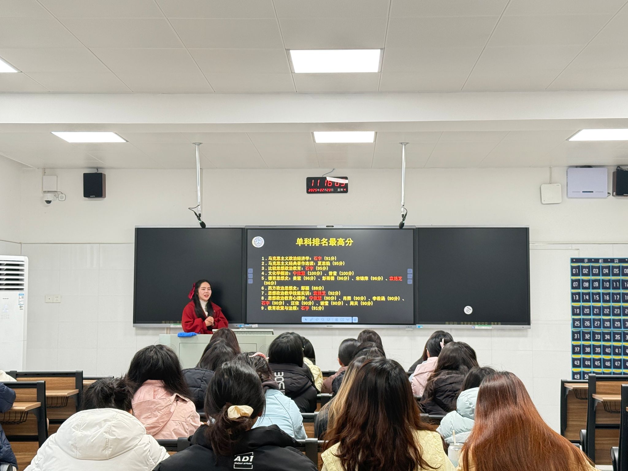 刘佳围绕应对开学焦虑、成绩状况、班级规章制度三方面展开阐述。她全面回顾了上学期班级的整体表现,对成绩优异和进步显著的同学提出表扬,也指出存在的不足,激励同学们在新学期奋勇争先。她表示,新学期新风貌,同学们需尽快调整作息,端正学习态度,遵守校纪校规,共同营造良好学风。