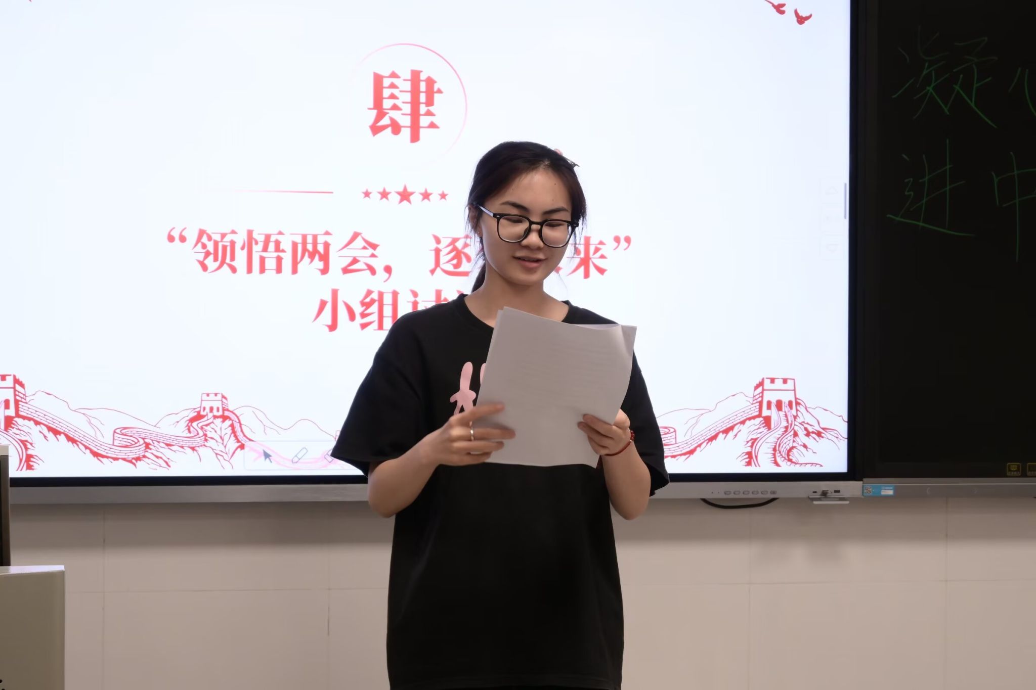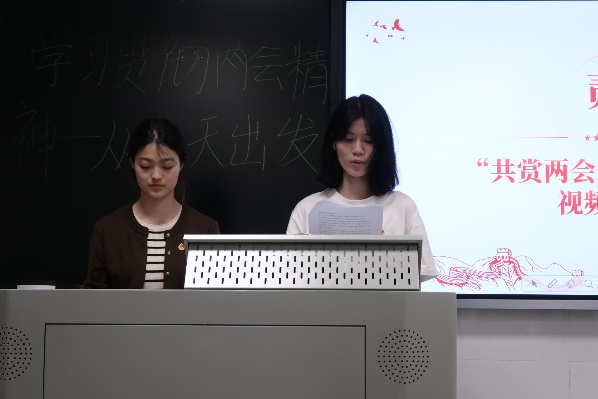 翁晓慧、陈乐盈以主题宣讲、视频欣赏的形式带领全体成员认真学习了“两会”精神的深刻内涵,并通过组织开展小组讨论、妙手绘心等环节增加了成员间的互动交流,增强了团队凝聚力。