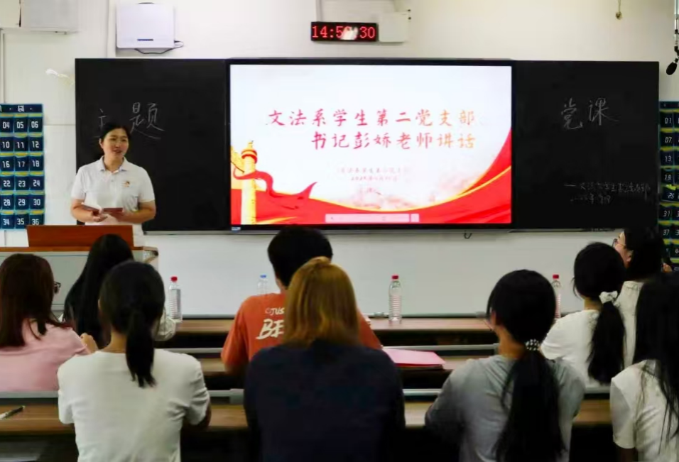 (通讯员 赵晶晶 席琴)9月18日下午,我院文法系学生第二党支部在树达楼107教室开展以“山河已无恙,吾辈当自强”为主题的微党课。文法系学生第二党支部书记彭娇出席微党课。微党课由文法系学生第二党支部组织委员黄雪琴担任主讲人。