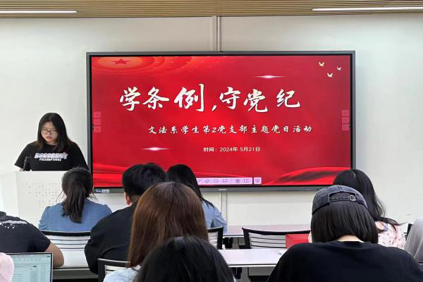 (记者 黄雪琴 熊贝贝 周慧)5月21日上午,我院文法系学生第二党支部在党员之家开展以“学条例,守党纪”为主题的党日活动。文法系学生第二党支部第一书记彭娇出席活动。活动由文法系学生第二党支部党员周慧主持。