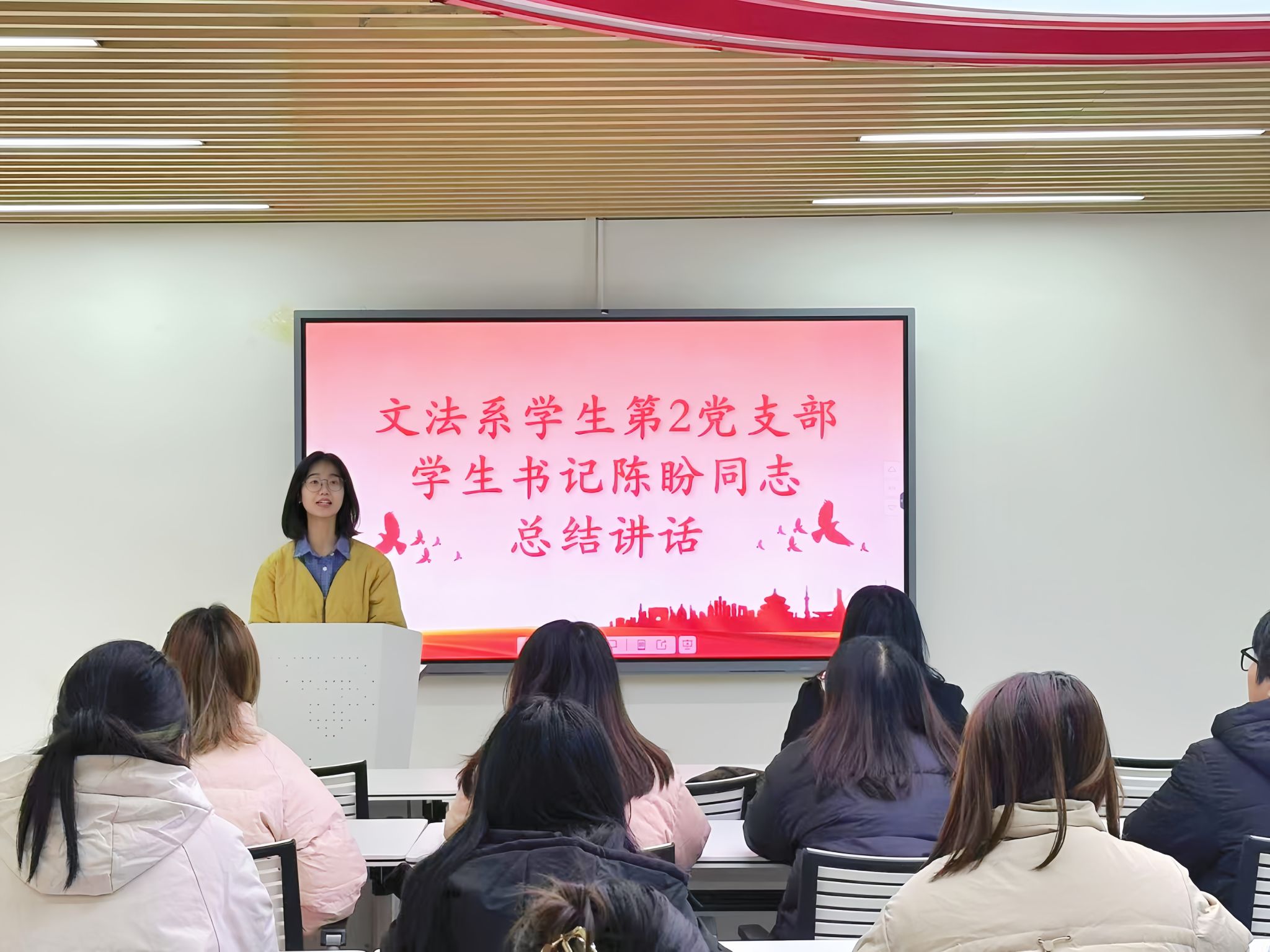 文法系学生第二党支部学生书记陈盼作活动总结。她表示,每位党员都应该对本年度的学习和工作进行年末总结,继续加强理论知识的学习,不断提高自身政治觉悟、道德品质和文化素养。