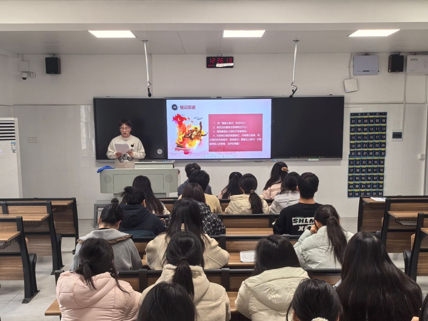 马炜浩从南京大屠杀的历史背景、国家公祭日的设立等方面展开阐述。他表示,作为青年党员,要将国家公祭日牢记于心,将历史的磨难与屈辱铭记于心,增强爱国主义信仰,坚定理想信念,时刻铭记落后就要挨打,只有强大自我,树立强烈的民族意识、团结意识、爱国主义意识,才能赢得敌人的敬畏、世界的尊重。