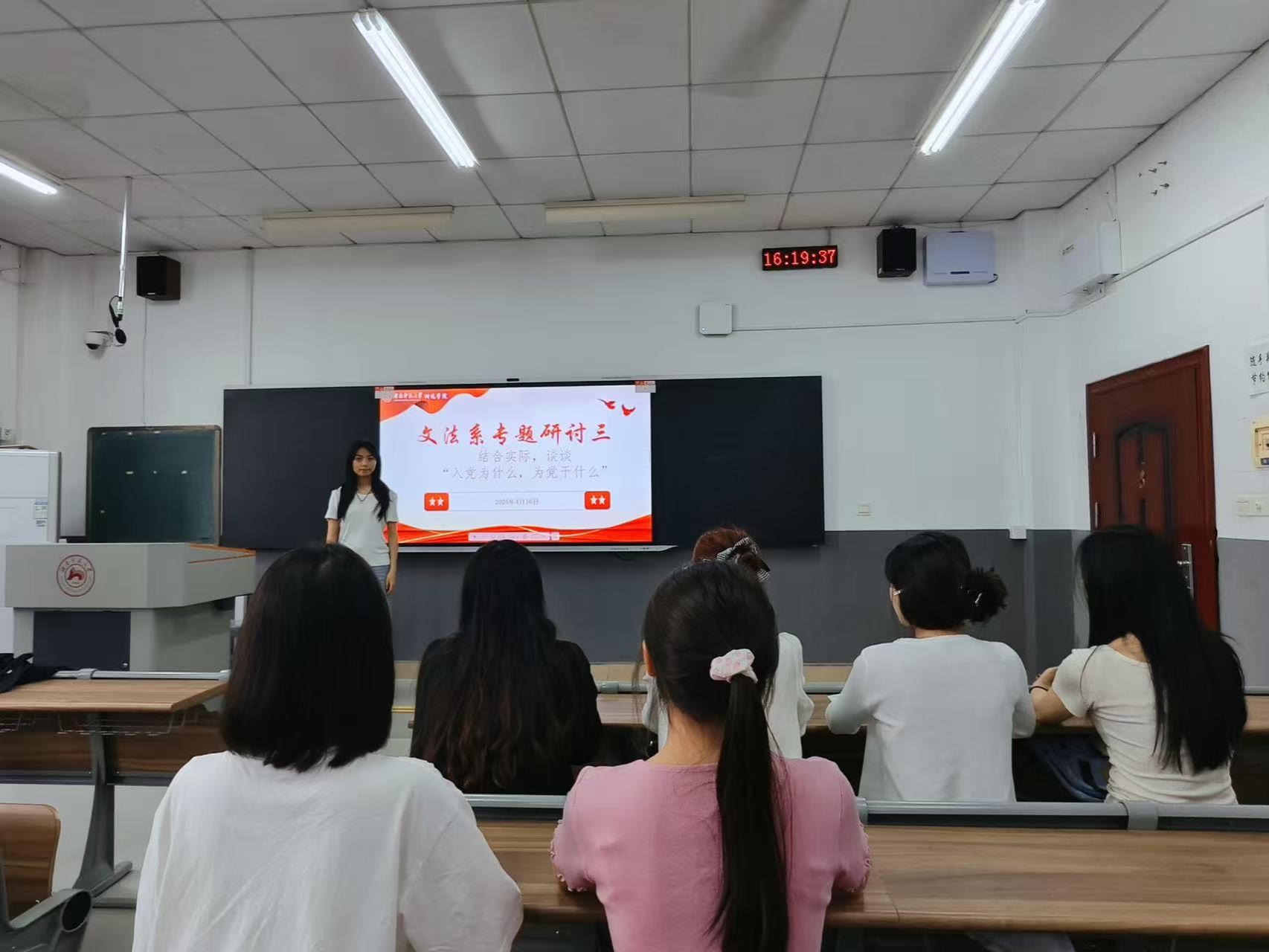 (通讯员 熊贝贝 吴思桥 谭思)4月16日下午,我院文法系学生第二党支部第23期发展对象小组在树达楼503教室召开以“结合实际,谈谈‘入党为什么,为党干什么’”为主题的专题研讨会。会议由第23期发展对象刘晚婷主持。