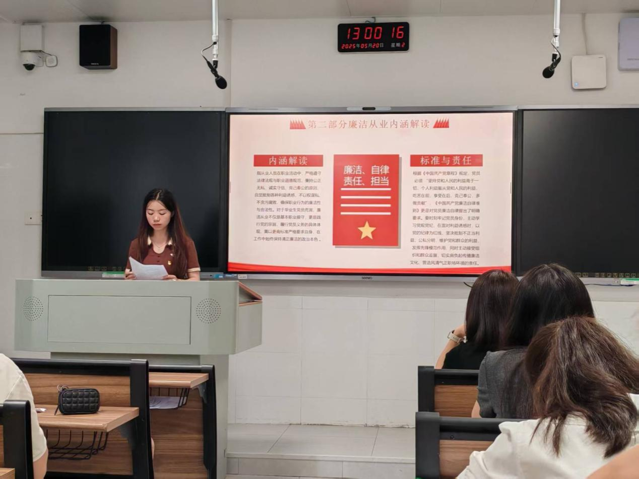 熊椰对毕业生党员们表达了殷切的嘱托。她强调,毕业生党员即将踏入职场,廉洁从业,不仅是个人安身立命的职业底线,更是党员维护党的形象、践行初心,牢记使命的政治要求。她希望,同学们能够将誓词铭刻于心,外化于行,让“廉洁”二字成为职业生涯的底色,让“为人民服务”成为终身践行的信仰。