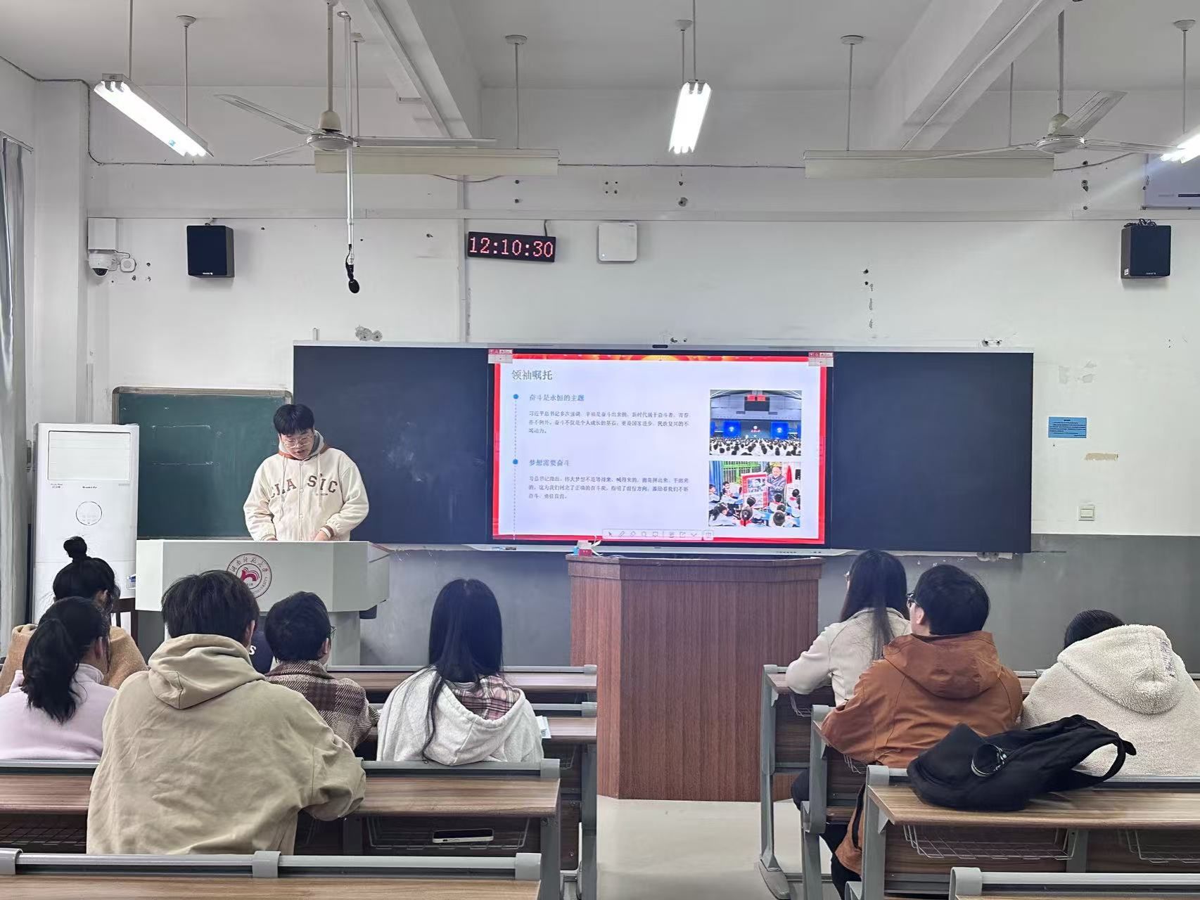 余嘉程围绕光辉历程、时代强音、榜样力量、立足当下、展望未来五个方面展开分享。他指出,奋斗既是个人成长的根基,也是国家进步、民族复兴的动力源泉。在榜样力量维度,他带领大家学习张桂梅的精神内核。他表示,成员们要传承无私奉献、坚韧不拔的品质,在校期间不断扎实师范专业知识,锤炼教学技能,为未来走上讲台打下坚实基础。